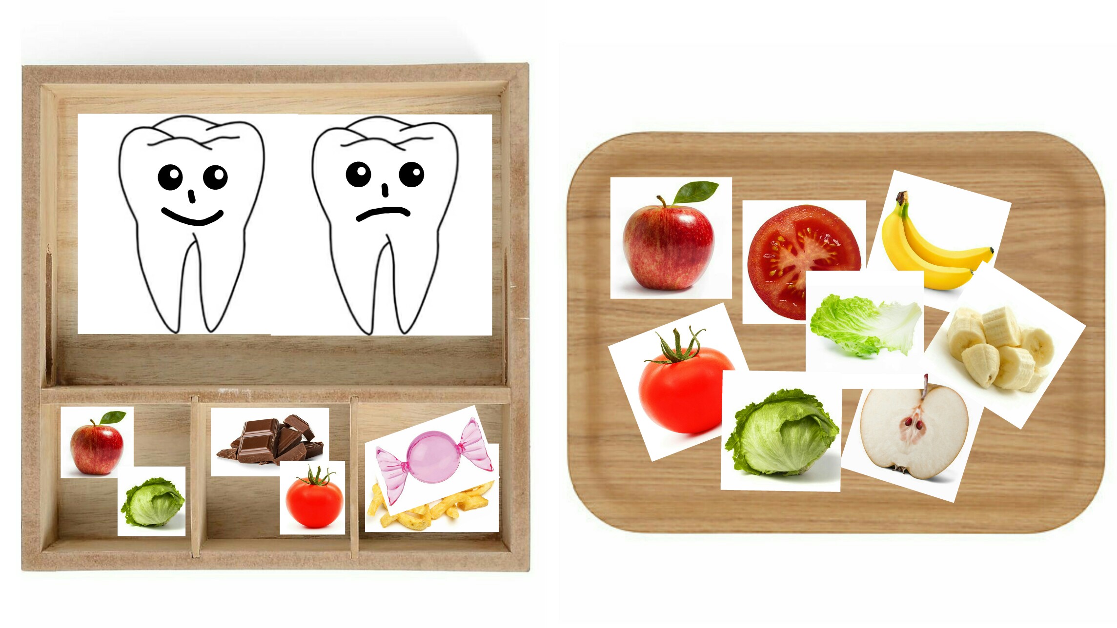 Ziele: Was ist gesund und was nicht? Mit dieser Übung lernt euer Kind etwas über gesunde Zähne. Schließlich gibt es Lebensmittel, die den Zähnen mehr und weniger Schaden zufügen. Lasst zunächst euer Kind überlegen, was es für gesund und ungesund hält, bevor ihr mit eurem Kind darüber sprecht. Wenn es etwas „falsch“ zugeordnet hat, fragt einfach mal nach was daran gesund sein könnte. Die Ansichten der Kinder sind sehr interessant.