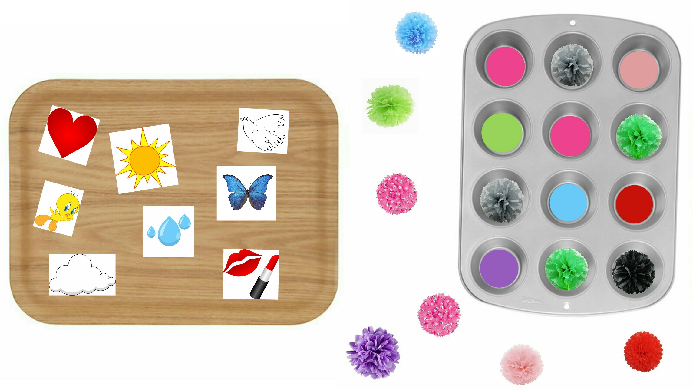 Ziele: bei diesem Lerntablett geht es um sortieren und vergleichen. Die Farben der Pappe und der Puschel müssen jeweils übereinstimmen. Das Muffin-Backblech ist eine super Alternative für das Tablett. Denn so können die Puscheln nicht weg rollen.